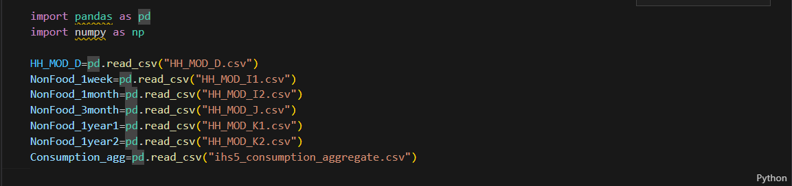 Every analysis has to start somewhere. For me, it began in my VS Code Jupyter Notebook, where I first imported the essential libraries; pandas and numpy. With those in place, I loaded the CSV files containing the IHS5 survey datasets. This step simply brought all the raw data into Python, ready for the cleaning and transformation that would follow.