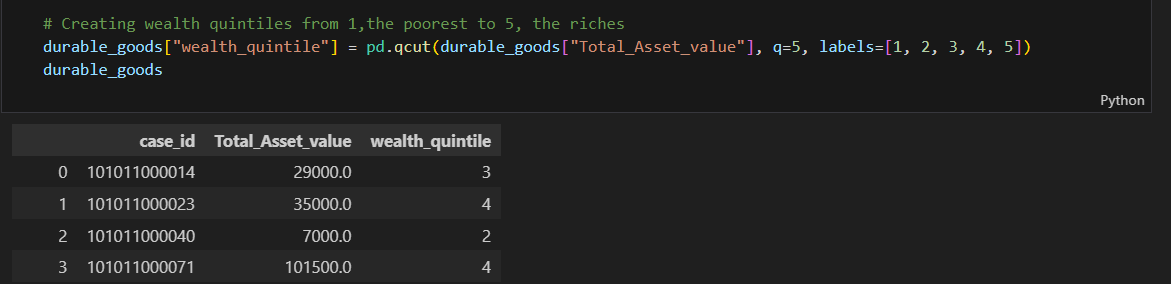 I categorized households into five wealth levels using Python’s qcut() function; Level 1 for the poorest, Level 5 for the richest. Each household was assigned a level based on its Total Asset value, which I had to calculate first.