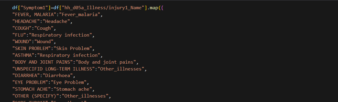 | .map() | pandas | A Series method used for substituting each value in a Series with another value, often using a dictionary (key-value mapping). | To Recategorize various illnesses/symptoms (e.g., 'FEVER, MALARIA') into new, simplified categories. |