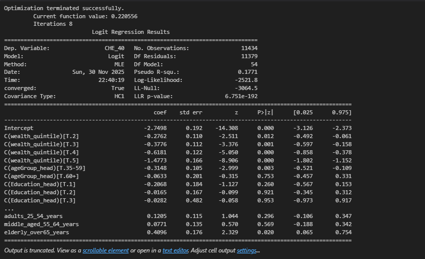 After the descriptive phase, I built a binary logistic regression model to see which factors predicted the likelihood of catastrophic health spending. Python made it easy to fit the model and display results clearly. The output showed exactly which household characteristics increased or reduced the risk of catastrophic health expenditure.